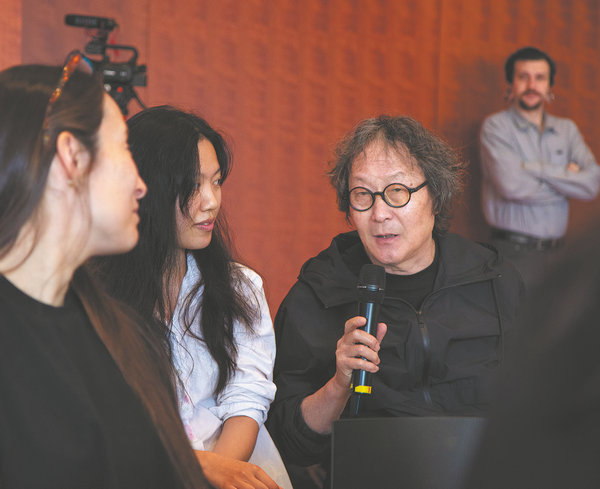 Xu Bing discusses his concept of art with an audience at the Asia Society Texas Center in Houston on Feb 23. [Photo by MAY ZHOU/CHINA DAILY]