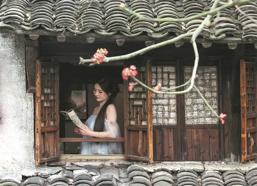 A woman finds a peaceful moment with a book in water town Wuzhen, Zhejiang.[Photo provided by Lan Hongguang/Xinhua]