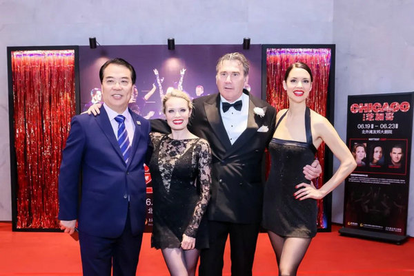 Qin Tiji (left) general manager of AIA Grand Theatre and actors of Chicago: The Musical, Sarah Soetart (second from left), Ian Kelsey (second from right) and Djalenga Scott (first from right), pictured before the Shanghai premiere on Jun 19. [Photo provided to China Daily]